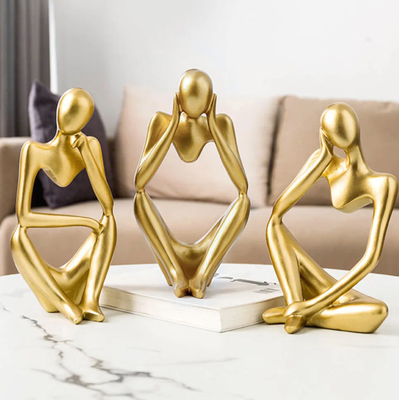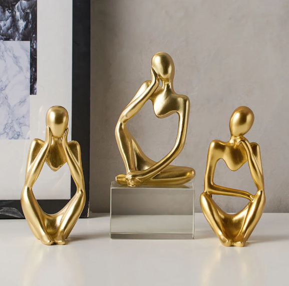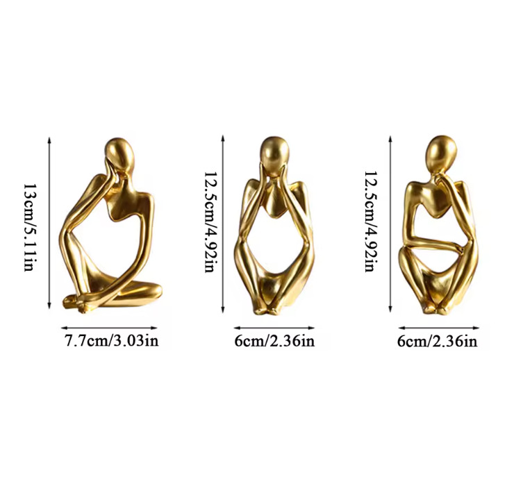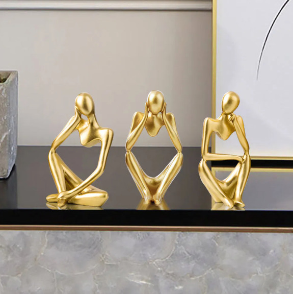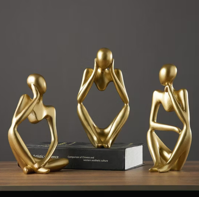 Diese drei goldenen Skulpturen vereinen minimalistisches Design mit emotionaler Tiefe. In stilisierter Form zeigen sie Momente des Innehaltens, der Reflexion und des Träumens – perfekt für stilvolle Wohnräume, die nicht nur dekorieren, sondern auch inspirieren sollen.